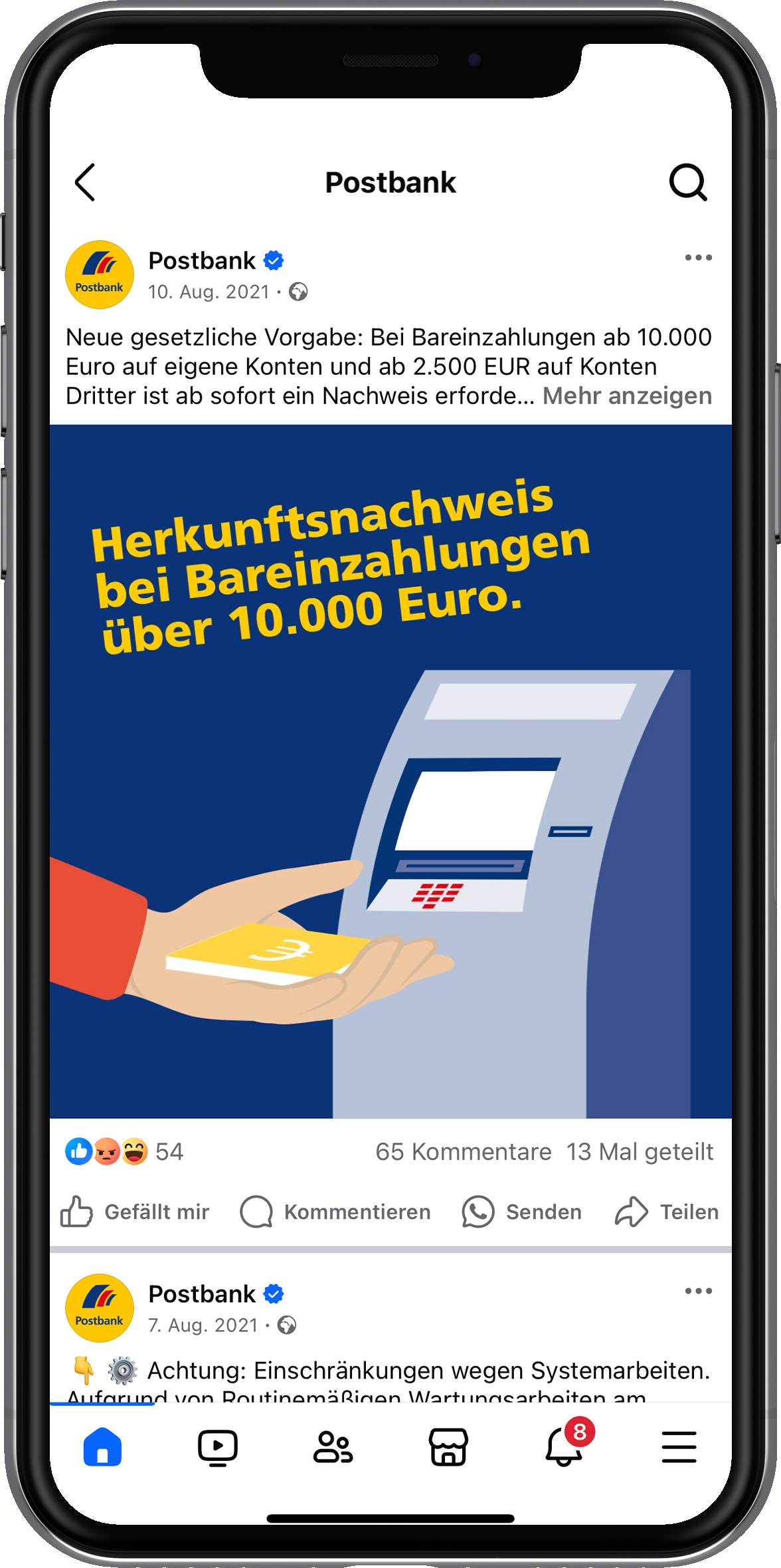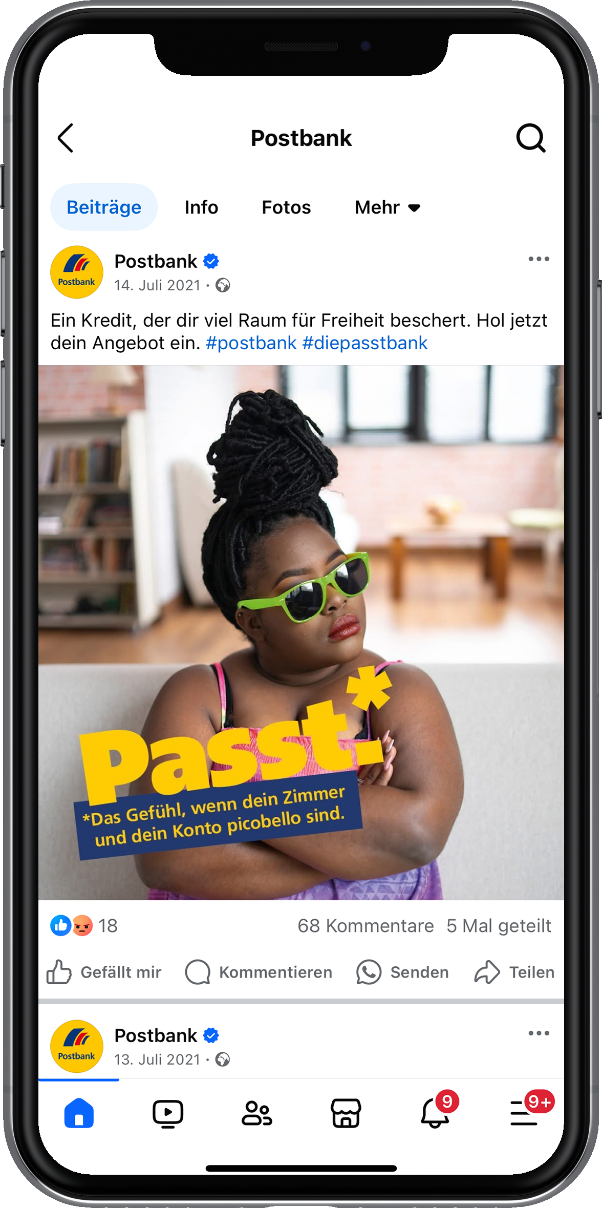 Den Facebook-Kanal der Postbank habe ich 1,5 Jahre lang als kreativer Kopf mitgestaltet und weiterentwickelt – mit klarem Fokus auf Reichweitenaufbau und Neukundengewinnung. Besonders spannend: Ab Mitte 2021 galt es, die neue Markenidentität unter dem Claim „#diepasstbank“ auch visuell Schritt für Schritt in den Kanal zu überführen. Die Herausforderung bestand darin, die neue Tonalität und Gestaltung konsistent und gleichzeitig lebendig im Social-Media-Kontext zu verankern.